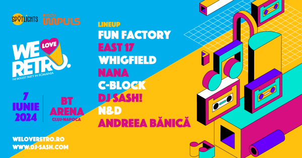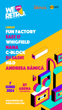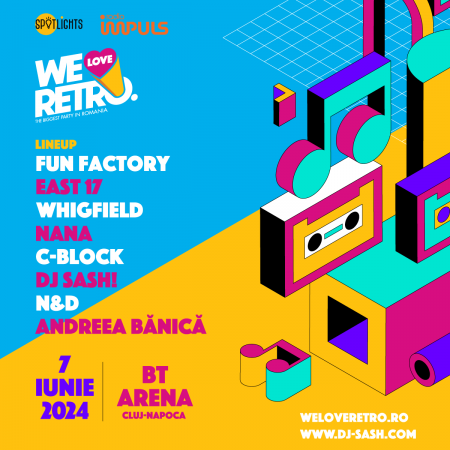Fun Factory, East 17, Whigfield, Nana, C-Block, DJ Sash!, N&D și Andreea Bănică vor concerta pe 7 iunie, la ediția de 10 ani a We Love Retro, cel mai mare retro party din România. Petrecerea, care va avea loc în BT Arena din Cluj-Napoca, va începe la ora 20:00 și va dura până dimineață. Accesul publicului se va face începând de la ora 19:00.