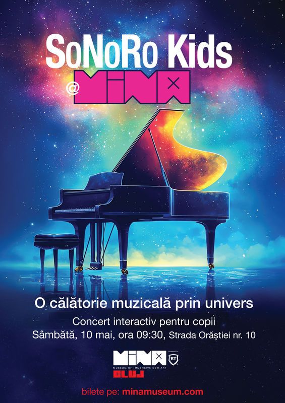 Pe 10 mai, MINA Cluj și SoNoRo Kids prezintă un eveniment special pentru copii și părinți, unde muzica și explorarea universului se împletesc într-o experiență captivantă!