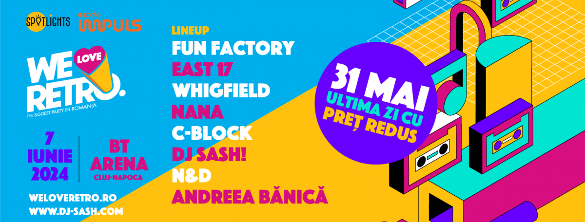 BILETELE (https://www.entertix.ro/evenimente/20812/we-love-retro-7-iunie-2024-bt-arena-cluj-napoca.html) sunt disponibile pe www.weloveretro.ro și pe Entertix.ro .