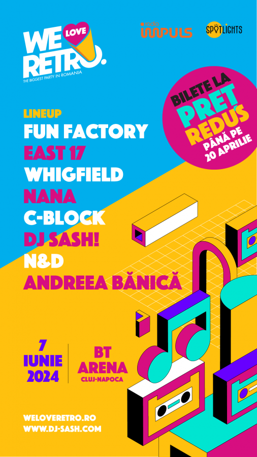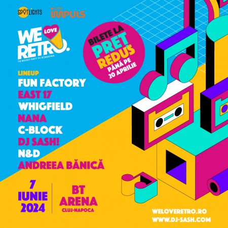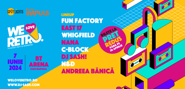 Fun Factory, East 17, Whigfield, Nana, C-Block, DJ Sash!, N&D și Andreea Bănică vor concerta pe 7 iunie, de la ora 20.00, la BT Arena din Cluj-Napoca, la ediția de 10 ani a We Love Retro, cel mai mare retro party din România. Biletele mai au prețuri REDUSE până pe 20 aprilie, de la acea dată încolo urmând să fie disponibile numai bilete la PREȚ ÎNTREG.