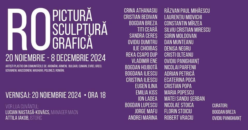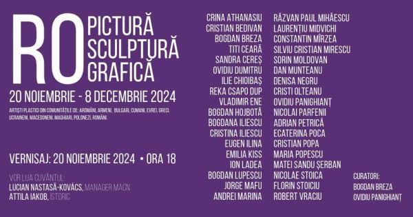 Muzeul de Artă Cluj-Napoca, instituție publică de interes județean, care funcționează sub autoritatea Consiliului Județean Cluj, vă invită să vizitați, în perioada 20 noiembrie – 8 decembrie 2024, expoziția „RO. Pictură, sculptură, grafică”. Vernisajul va avea loc miercuri, 20 noiembrie, de la ora 18. Vor lua cuvântul: Lucian Nastasă-Kovács, managerul muzeului, și Iakob Attila, istoric.
