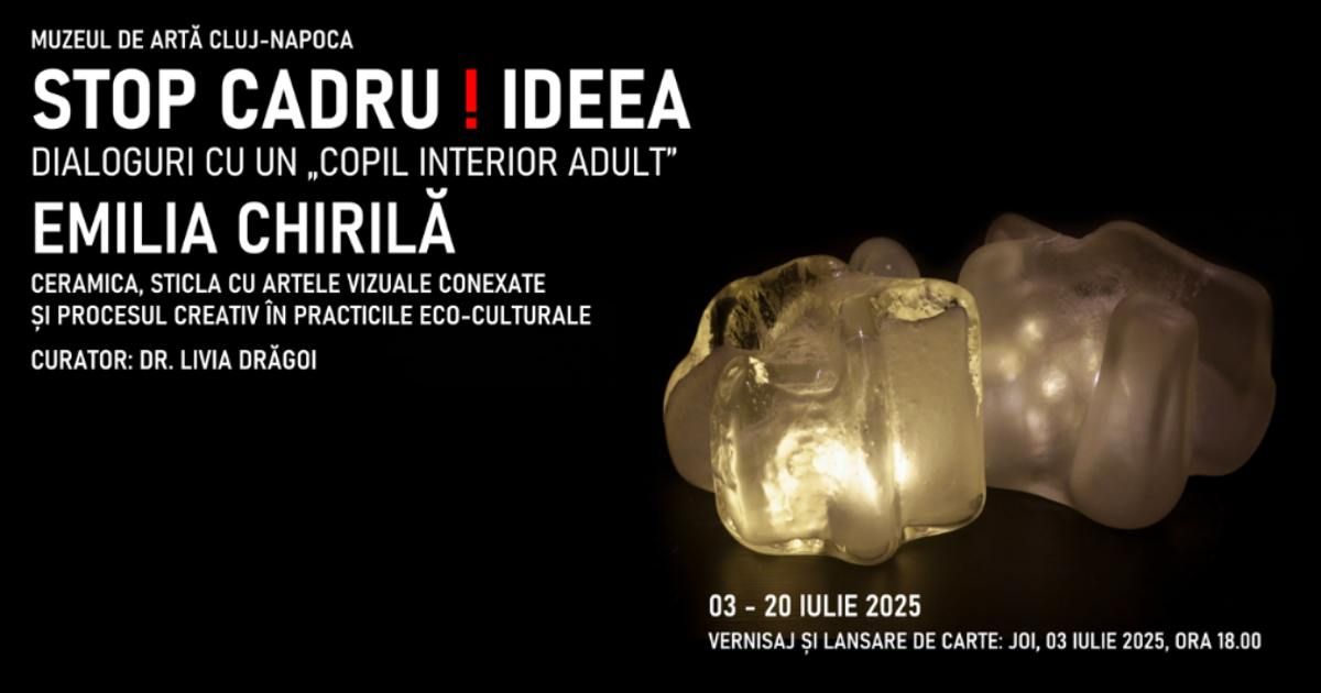 Muzeul de Artă Cluj-Napoca (MACN), instituție publică de cultură care funcționează sub autoritatea Consiliului Județean Cluj, vă invită să vizitați, în perioada 3 – 20 iulie 2025, expoziția personală a artistei Emilia Chirilă, „STOP CADRU! IDEEA – Dialoguri cu un copil interior adult”. Expoziția explorează intersecția dintre ceramică, sticlă, artele vizuale conexe și procesul creativ, integrate într-un demers eco-cultural.