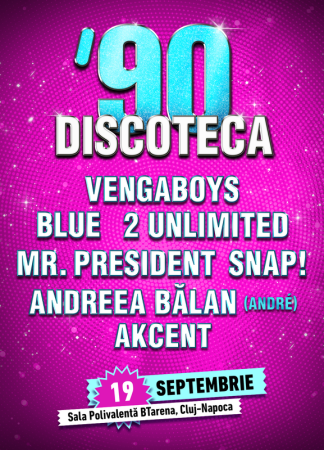 VENGABOYS, BLUE, 2 UNLIMITED, MR. PRESIDENT, SNAP!, ANDREEA BĂLAN (ANDRÉ) și AKCENT vor concerta la DISCOTECA ‘90 CLUJ 2025 vineri, 19 SEPTEMBRIE, începând cu ora 19:00, la Sala Polivalentă BTarena din Cluj-Napoca, în cadrul celei de-a 3-a ediții a evenimentului. Ne vom distra pe cele mai energice ritmuri și vom celebra, împreună, spiritul tânăr, cântând și dansând pe melodii ca ”We’re Going To Ibiza” – VENGABOYS, ”All Rise” – BLUE, ”No Limit” – 2 UNLIMITED, ”Coco Jamboo” – MR. PRESIDENT, ”Rhythm Is A Dancer” – SNAP!, ”Lasă-mă papa la mare” – ANDREEA BĂLAN (ANDRÉ) sau ”Buchet de trandafiri” – AKCENT. Între show-urile artiștilor, disco ball-ul va continua să strălucească pe hiturile acelor vremuri, mixate de DJ-ul rezident al evenimentului.
