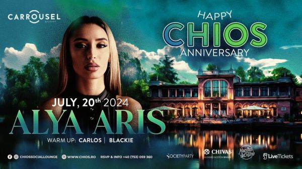 oin us on July 20, 2024, at 18:00 for the second night of the HAPPY CHIOS ANNIVERSARY celebration featuring the sensational ALYA ARIS and our resident DJ's Blackie & Carlos!