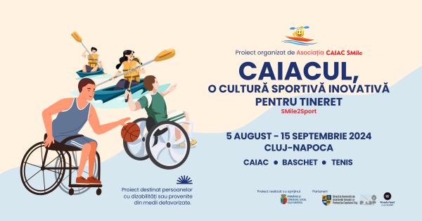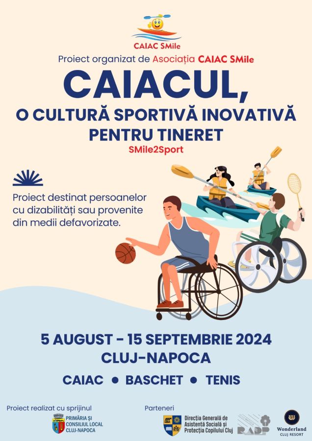 Asociaţia Club Sportiv Caiac SMile, cu sprijinul Primăriei Municipiului Cluj-Napoca, revine la Cluj-Napoca pentru cea de-a patra ediție a proiectului ”Caiacul, o cultură sportivă inovativă pentru tineret”, SMile 2 Sport. Și în acest an, activitățile sportive sunt destinate persoanelor cu nevoi speciale și tinerilor din centre de plasament, precum și tuturor celor care vor să li se alăture, în spiritul incluziunii promovate de Asociație, și se vor desfășura în Cluj-Napoca, în perioada 5 august - 15 septembrie 2024.