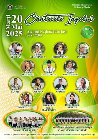 Asociația Filantropică Sfântul Ioan și Maria împreună cu Ateneul Național din Iași, vă invită marți, 20 mai 2025, ora 17.00, în Sala Mare de Spectacole „Radu Beligan” la un spectacol de muzică populară ce adună împreună voci de renume ale cântecului popular ieșean, acompaniate de Ansamblul de viori „Prietenia”, prof. Paul Șerban și Ansamblul Folcloric „Floare de bujor”, coregraf Cristian Ostafi. Eveniment prezentat de Bianca Martinică.