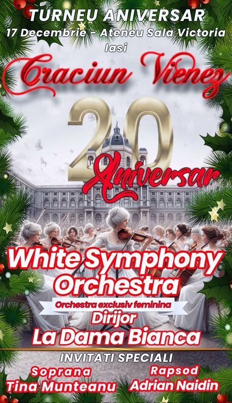 Bucurați-vă de un concert aniversar de excepție, "Crăciun Vienez", care sărbătorește 20 de ani de muzică și magie. Alături de White Symphony Orchestra, sub bagheta dirijorului La Dama Bianca, și avându-i ca invitați speciali pe soprana Tina Munteanu și rapsodul Adrian Naidin, acest eveniment promite o seară de neuitat. Orchestra, formată exclusiv din femei îmbrăcate în superbe rochii albe de seară, va interpreta melodii clasice vieneze și piese tradiționale de Crăciun. Tina Munteanu va aduce emoție și sensibilitate cu vocea ei angelică, iar Adrian Naidin va impresiona cu virtuozitatea sa instrumentală și pasiunea pentru muzica tradițională românească. Nu ratați această ocazie de a sărbători și de a vă bucura de farmecul și bucuria muzicii de Crăciun!