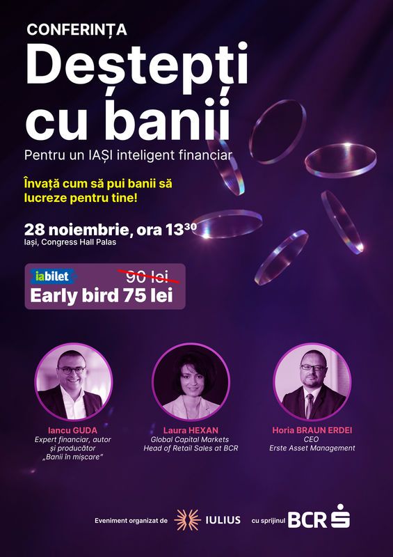 Atunci vino la conferinta "Deștepti cu banii", care va avea loc pe 28 noiembrie 2023, ora 13:30, la Congress Hall Palas
