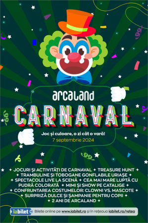 O zi de neuitat, plină de aventuri și distracție! ARCALAND CARNAVAL este cel mai așteptat eveniment al verii, singurul pe care îl veți ține minte și povesti cu entuziasm la începutul anului școlar! Sub sloganul "Joc și culoare, o zi cât o vară", ediția a doua a acestui eveniment promite o explozie de culoare, bucurie, sărbătorind totodată 2 ani de ARCALAND!