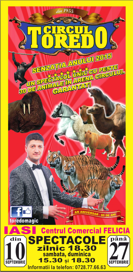 Cu mic, cu mare sunteti asteptati al cel mai frumos circ care poposeste in acest an pe colinele orasului Iasi cu 30 de animale in arena. In perioada 10 - 27 septembrie 2015 sunteti asteptati la un program de exceptie de care suntem siguri ca va veti bucura la maxim alaturi de copii vostri sau alaturi de prieteni ori familie.