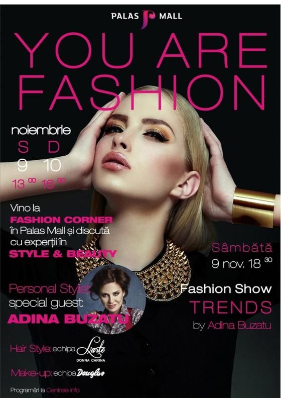 Prezentările de modă sunt parte a Fashion Corner-ului din Atriumul Palas Mall. Sâmbătă şi duminică, 9 şi 10 noiembrie, între orele 13.00 – 16.00, specialiştii îi aşteaptă pe doritori la sesiuni gratuite de hair styling, make-up şi fashion. În acest sfârşit de săptămână, invitata specială este Adina Buzatu, care le va oferi doritorilor sfaturi în alegerea stilului vestimentar potrivit. Stilista este a treia vedetă care trece pragul Fashion Corner-ului, după ce în week-end-urile anterioare au fost invitaţi Alin Gălăţescu şi Geta Voinea. Pentru a beneficia de sfaturile preţioase ale profesioniştilor, clienţii trebuie să cumpere de minimum 100 de lei din magazinele Palas Mall şi să se programeze la Centrele Info.