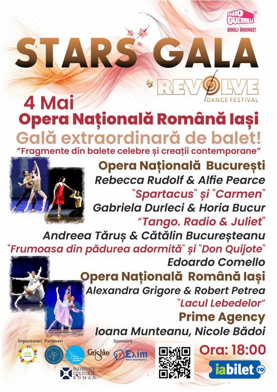 Asociația Mapamond și Revolve Dance vă invită la un eveniment coregrafic monumental pe scena Operei Naționale Române din Iași. Ediția de Iași a turneului național Stars Gala reprezintă o întâlnire de înaltă ținută artistică între soliștii de prestigiu ai Capitalei și mândria scenei coregrafice ieșene, într-un spectacol ce parcurge istoria dansului, de la capodoperele clasice la estetica neoclasică și contemporană.