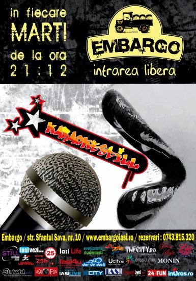În fiecare seară de marţi te aşteaptă în Embargo să te distrezi la maxim. Noi îţi punem la dispoziţie microfoanele, negative din plin şi foarte multă distracţie. În plus, dacă nu ai talentul la tine, nu trebuie să te îngrijorezi, deoarece artiştii prezenţi vor fi mai mult decât pregătiţi să te ajute să-ţi realizezi propriul show.