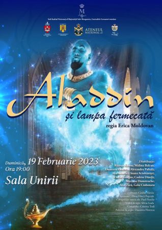 „Aladdin și lampa fermecată” este o transpunere scenică impresionantă a poveștii populare orientale, cu costume minunate, realizate de Alina Dincă Puscasu, video-design-uri care vă vor transpune în minunata lume Disney, compoziții muzicale semnate Paul Pintilie.