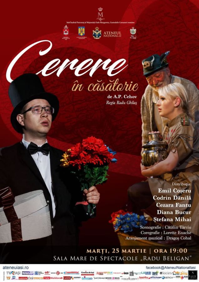 << Vodevilul „Cerere în căsătorie” de A.P. Cehov poate fi considerat un studiu despre căsătorie în ideea de pact, de alianță liber consimțită între bărbat și femeie, mai mult decât o uniune, nu în sens spiritual, ci mai degrabă pragmatic, material. Până la semnătură și „da” avem, mai întai, cerere și ofertă. Ivan Vasilievici Lomov se hotărăște să-i ceară mâna fiicei lui Stepan Stepanovici Ciubukov, Natalia Stepanova, aducând în discuție bineînțeles, „zestrea”, Poiana boilor, ce duce la o serie de conflicte și tensiuni, bazate pe un joc de putere și de dominare.