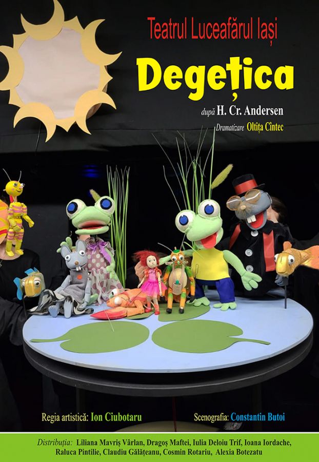 The adaptation for stage of the well-known story by Hans Christian Andersen, Thumbelina, is a “room version” of the story, imagined by director Ion Ciubotaru. He says that “we thought of a performance that is faithful to the story known by everyone, while also respecting, in the process of dramatization, the entire narrative. The literary work is so beautiful that there was no need for additions or updates. Naturally, the show is not an illustration, but a theatrical creation in which each character has individual traits that come from the way he or she is imagined by the actors.”