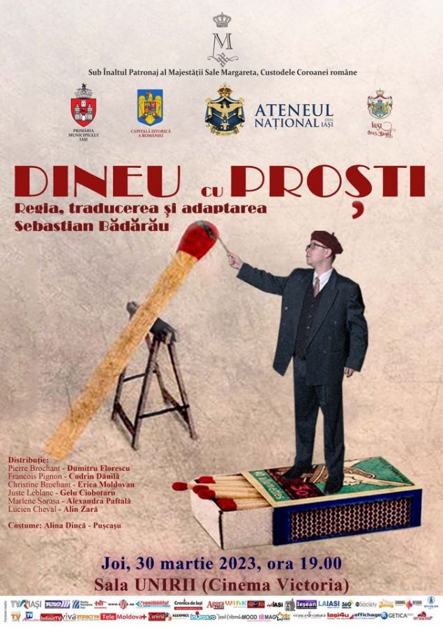 „Dineu cu Proști” e un spectacol despre triumful inocenței și al onestității în fața minciunii și al derizoriului. Despre cum lumea împarte oamenii în alb și negru, în proști și deștepți, prejudecăți bazate pe valorile burgheze de acum o sută de ani. Francois nu deține armele sociale corespunzătoare pentru a fi considerat deștept. E sensibil, iertător, onest și prin urmare luat de prost. Pierre deține toate aceste arme dar la nivel interior este mult mai pierdut și singur decât Francois, care știe să trăiască în prezent și să se bucure de orice clipă. Una dintre cele mai de success comedii ale ultimilor ani, piesa a fost montată și pe Broadway și tradusă în 18 limbi. Pentru prima oară montată la Iasi, spectacolul nostru va face cu siguranță să vă apropiați cu empatie față de cei considerați „mai slabi” sau „săraci cu duhul” și să râdeți măcar de valorile astea învechite de care pomeneam.”