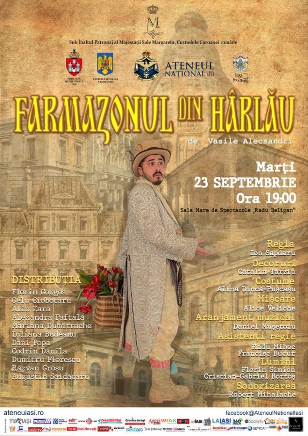 Cu ”Farmazonul din Hârlău”, comedie în trei acte, începe istoria acestui teatru. Premiera a avut loc într-o zi de luni, 18 noiembrie 1840 și cu această ocazie a fost lansată și cartea, cu legătură de epocă, cotor și colțare de piele. Cartea are 50 de pagini, este scrisă în limba română, dar cu caractere chirilice.