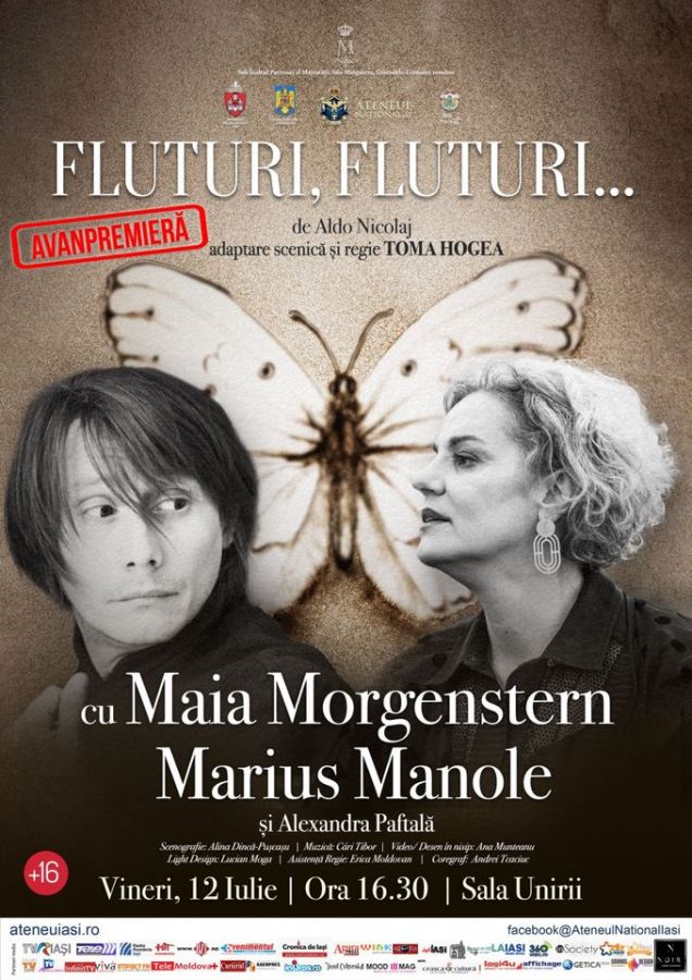 Textul lui Aldo Nicolaj, “Fluturi, Fluturi”, este povestea unei femei singure, o femeie care își joacă în propria viață rolul pe care își dorește să-l prezinte lumii: o femeie puternică, frumoasă și independentă, care s-a lăsat curtată și iubită de bărbați cu statut material și social, fără a se supune vreunuia dintre ei. EDDA, căci despre ea este vorba, este femeia pentru care familia și copiii sunt poveri, piedici în calea desfășurării narcisismului. Este femeia care nu poate face distincție între realitate și iluzie, care trăiește în propria lume și care refuză să accepte realitatea. Este o poveste de viață care se derulează de la finețea comediei spre profundul dramatism, o poveste despre iluzie, vise, iubire, adevăr și asumarea lui. Cele trei personaje din distribuție le regăsim astăzi în diverse familii, părând a fi universale. Noua premieră “FLUTURI, FLUTURI” va impresiona prin originalitatea montării, a spațiului de joc, prin elementele vizuale (desen în nisip), printr-o muzică originală care va puncta fiecare moment comic sau dramatic și, nu în ultimul rând, printr-o distribuție perfectă: Maia Morgenstern, Marius Manole și Alexandra Paftală. Această nouă premieră, “FLUTURI, FLUTURI”, aduce la rampă o producție teatrală deosebită, presărată cu momente comice dar și cu mult, mult dramatism.