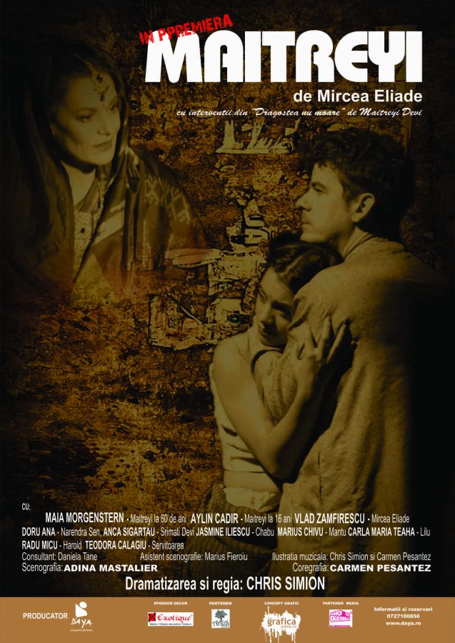 MAIA MORGENSTERN – Maitreyi la 60 de anI ,AILYIN CADIR – Maitreyi la 16 ani,VLAD ZAMFIRESCU – Mircea Eliade,DORU ANA – Narendra Sen, tatal lui Maitreyi,ANCA SIGARTAU – Srimati Devi, mama lui Maitreyi,JASMINE ILIESCU – Chabu, sora lui Maitreyi in varsta de 8 ani,CARLA MARIA TEAHA – Lilu, verisoara lui Maitreyi,MARIUS CHIVU – Mantu, verisorul lui Maitreyi ,RADU MICU – Harold, prietenul lui Eliade ,TEODORA GAROFIL – servitoarea,Coregrafia: Carmen Pesantez, Scenografia: Adina Mastalier Dramatizarea ,Regia artistica: CHRIS SIMION.