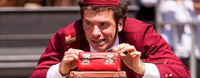 Suitcases inside suitcases inside suitcases… objects that continuously mutate and, in doing so, bring new scenes to life. Luigi Ciotta takes us back in time: an imaginary hotel, full of guests and too many old suitcases. It’s the 1930s, and music accompanies our delightful porter in his fight against the overwhelming forces of chaos. Everything in a Suitcase combines physical theatre, clowning, and circus trickery, while the simplicity of Luigi Ciotta engages the audience, who plays with this charming character in these fast-paced, and often, poetic pieces. The show mirrors the research into non-verbal comedy that Luigi carried out during his involvement in physical theatre: this has gone hand in hand with his research into the comic use of objects, which, in typical clown fashion, are dragged out of their original context to become something comical and fantastic. The audience’s imagination is aroused by a world of magic, games, and fantasy with a retro feel. Any job done over a long time becomes boring and repetitive, and so, after many years spent carrying people’s luggage, Luigi Ciotta’s character, an eccentric hotel porter, has learnt to look at things from a wholly different point of view and break the monotony of his alienating daily routine. This change in perspective is a constant theme in the show. Looking beyond (or perhaps better inside) ourselves and our minds, we can rediscover the ability to play with, well, nothing… and with the help of that nothing, we can distance ourselves from the daily grind and grasp the truly extraordinary nature of ordinary things.