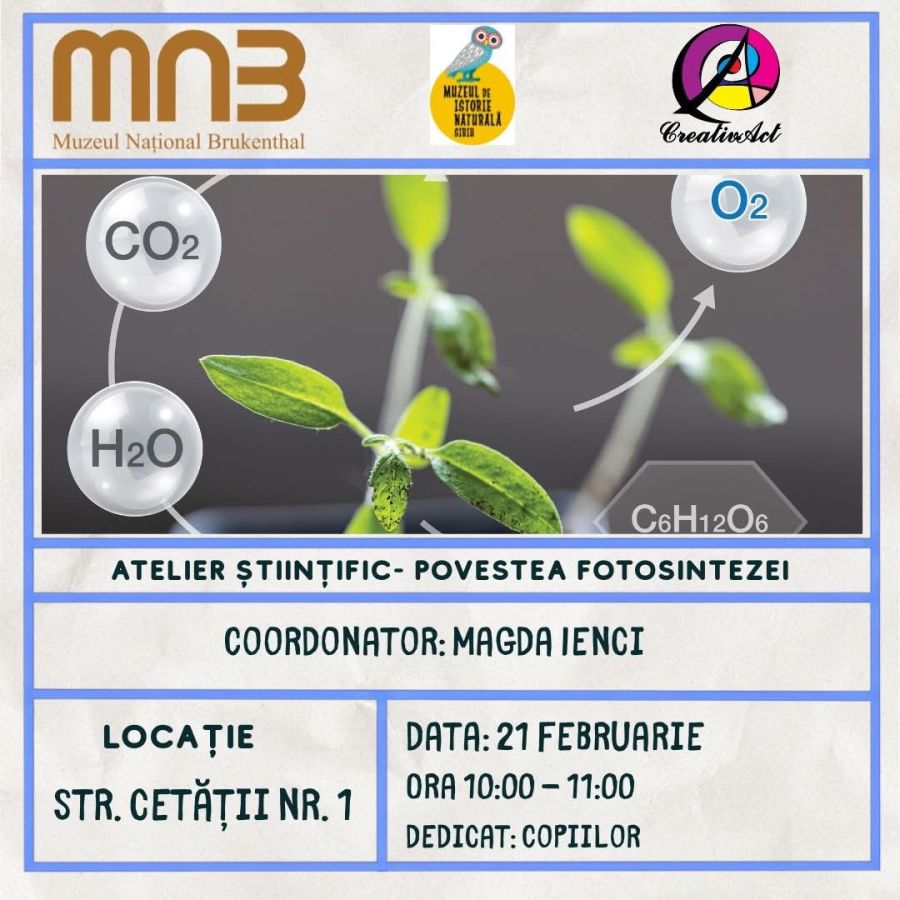 În cadrul acestui atelier descoperim, pas cu pas, povestea unuia dintre cele mai importante procese din natură. Prin explicații accesibile, exemple vizuale și discuții interactive, vom înțelege cum funcționează fotosinteza, cum sunt conectate plantele, aerul și viața de pe Terra și ce rol joacă acest proces în menținerea echilibrului ecosistemelor.