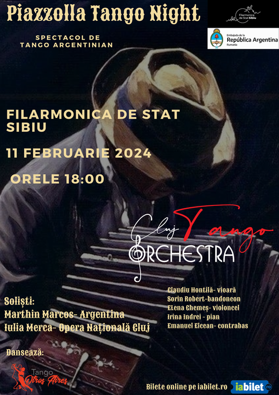 PIAZZOLLA TANGO NIGHT – se dorește a fi o serie de spectacole dedicate marelui compozitor Astor Piazzolla și geniului său componistic, puse în scenă de Asociatia „ Cluj Tango Orchestra „ pe scenele sălilor de spectacole din țară. Revenim cu drag la Filarmonica Sibiu, după succesul primului nostru concert aici în primavara anului 2024.
