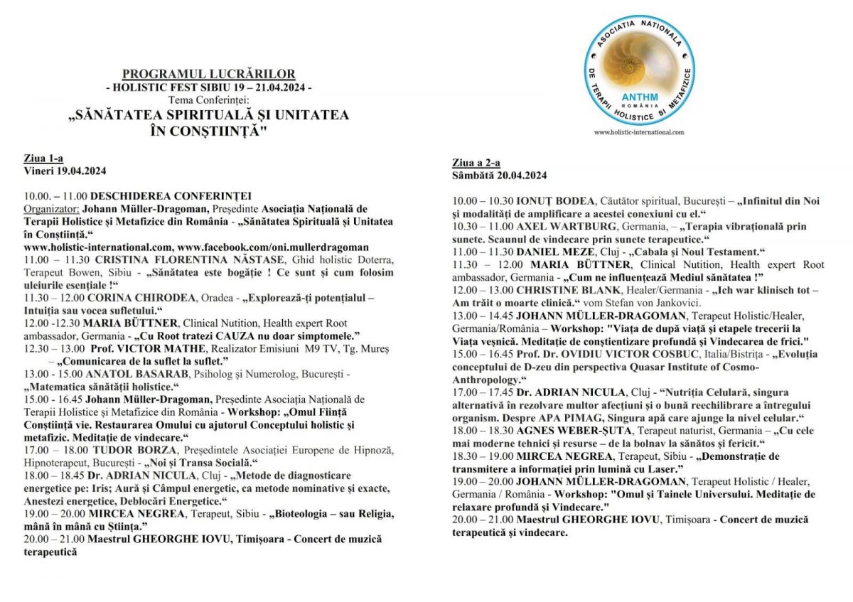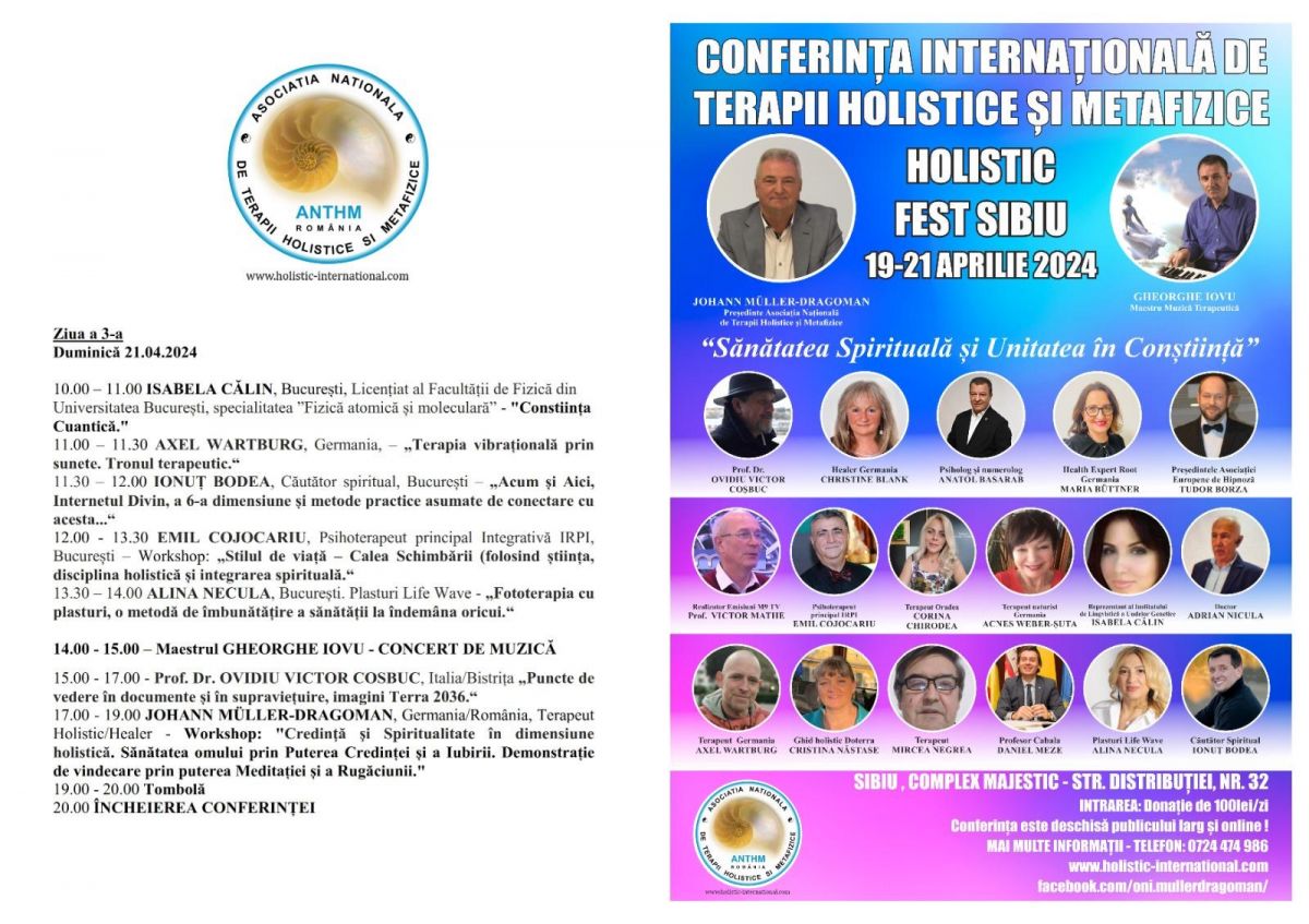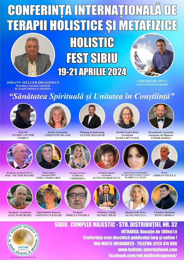 Mai multe informații despre Conferința HOLISTIC FEST SIBIU 19 – 21 aprilie 2024 găsiți pe website-ul Asociației ANTHM :