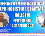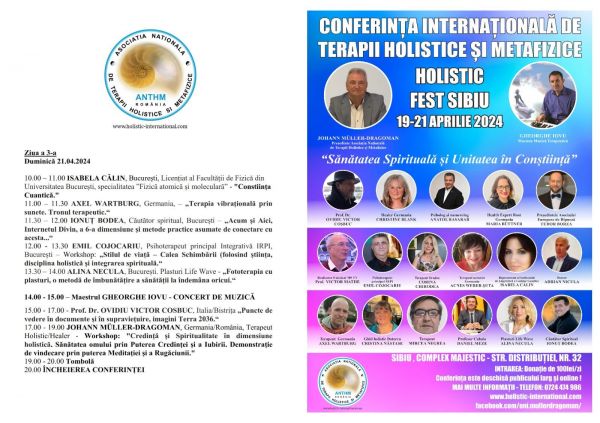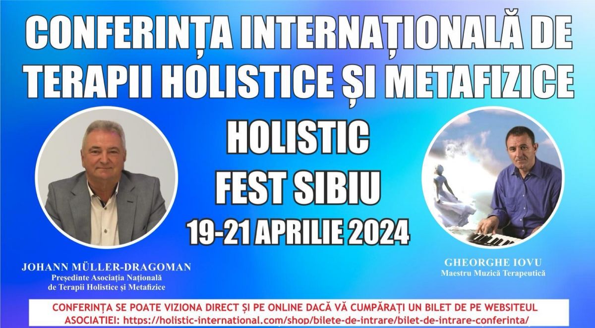 În perioada 19 – 21 aprilie, Sibiul găzduiește CONFERINȚA INTERNAȚIONALĂ DE TERAPII HOLISTICE ȘI METAFIZICE DIN ROMÂNIA - HOLISTIC FEST SIBIU 2024, organizată de către Asociația Națională de Terapii Holistice și Metafizice din România, deschisă timp de trei zile publicului larg, vineri, sâmbătă și duminică între orele 10.00-21.00.
