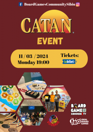Board Games Community Sibiu și Ideal Board Games te invită Luni, 11 Martie 2024, la ora 19:00, la un nou eveniment/campionat de Catan, care va avea loc in cadrul localului Voodoo Lounge de pe Strada Neppendorf din Sibiu. Mai multe detalii puteti gasi mai jos: