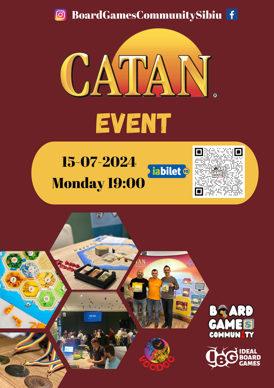 Board Games Community Sibiu și Ideal Board Games te invită Luni, la ora 19:00, la un nou eveniment/campionat de Catan, care va avea loc in cadrul localului Voodoo Lounge de pe Strada Neppendorf din Sibiu. Mai multe detalii puteti gasi mai jos:
