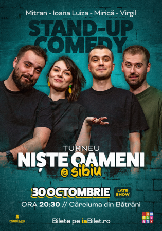 După succesul primului lor special, ”Fantastic. Revenim”, NișteOameni au scris MATERIAL NOU și vin să execute #standupcomedy în orașul tău, cu un show nou-nouț. Hai și tu să vezi la ce s-au mai gândit Sergiu Mirică, Ioana Luiza, Dragoș Mitran și Virgil Ciulin! Dacă tot ai internet, convinge-te că dai bani pe ce trebe. Caută-i pe YouTube, unde au o grămadă de bucăți de stand-up (iUmor, Stand-up Revolution), un special de comedie, un podcast, o emisiune șmecheră numită #NuȘtiuZic, dar și apariții la Una Scurtă sau Râzi că Prostu'.