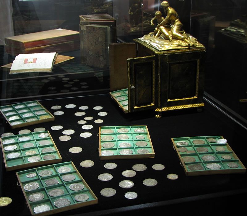 Cele mai multe dintre piese provin din moştenirea culturală lăsată de către întemeietorul muzeului, baronul Samuel von Brukenthal, dar sunt incluse în expunere şi monedele de aur achiziţionate ulterior, pe parcursul timpului, de către custozii colecţiei.