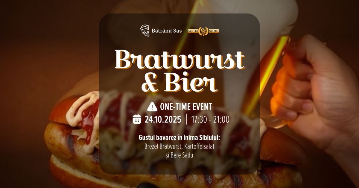 Vino să trăiești o seară bavareză, la Bătrânu' Sas Cibinium! Pe 24 octombrie, între 17:30 și 21:00, intrăm în atmosfera de Oktoberfest și ne ospătăm cu un bratwurst veritabil și bere locală.