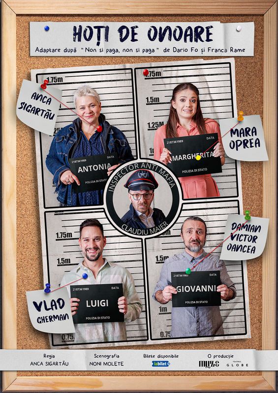 Adaptare după “Non si paga, Non si paga” de Dario Fo, comedia “Hoți de onoare” propune publicului o distribuție de excepție: Anca Sigartău, Damian Victor Oancea/Cristi Martin, Oana Moșneagu/Mara Oprea, Vlad Gherman/Valentin Sichim și Claudiu Maier. Aflați deja la a patra colaborare în teatru și după succesul extraordinar al celor două seriale TV, Adela si Lia, în care au jucat împreună, cei 5 actori ne promit o comedie extraordinară și garanteaza 2 ore de bună dispoziție.