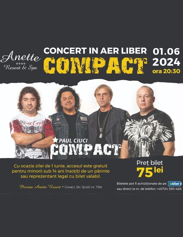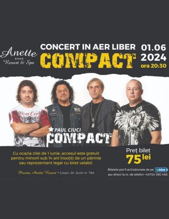 Pentru a -X-a oară la Covaci , în incinta ștrandului Anette , în aer liber , zona de concerte , Compact - Paul Ciuci ne va încânta cu piesele sale în data de 1 Iunie 2024 , ora 20.30 . Preț bilet 75 lei , copii au acces gratuit