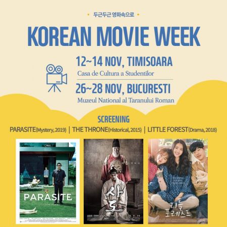 Organizat de către Ambasada Republicii Coreea în România, împreună cu Casa de Cultură a Sudenților din Timișoara și Consulatul Onorific al Republicii Coreea în Timișoara, festivalul de film din acest an urmează să înceapă la Timișoara, la Casa de Cultură a Sudenților, în perioada 12-14 noiembrie, 19:00, cu o proiecție zilnică a fiecărui film apreciat, respectiv „Parasite” (subtitrare în lb.română), „The Throne” (subtitrare în engleză) și „Little Forest” (subtitrare în engleză).