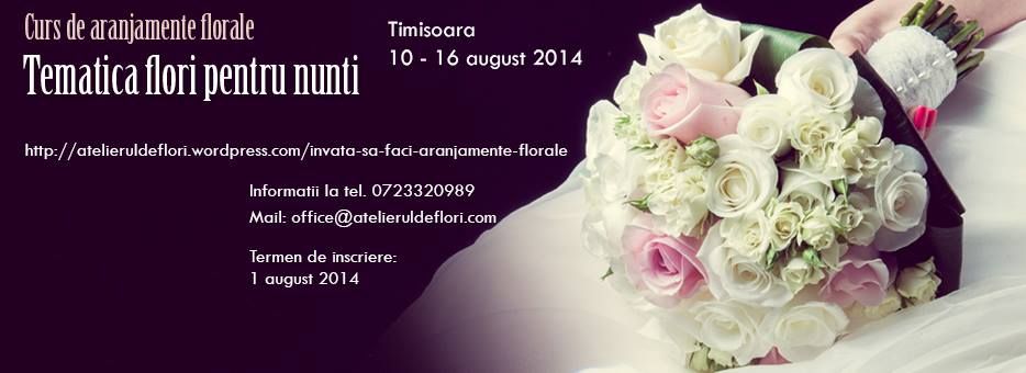 In perioada 10 - 16 august 2014 la Timisoara se organizeaza un program intens de curs de aranjamente florale cu tematica Flori pentru nunti. Timp de o saptamana, de dimineata pana seara veti experimenta activitatea de realizare a buchetelor si aranjamentelor florale specifice evenimentelor festive. Se pun la dispozitie toate materialelle si florile necesare pentru realizarea buchetelor, aranjamentelor sau a lumarilor de cununie. Programul include si o vizita la Piata de flori din Szeged, unde participantii vor experimenta toate aspectele legate de aprovizionarea unei florarii. La finalul programului, toti participantii primesc fotografii profesionale ale aranjamentelor realizate, care pot fi folosite pentru albume, afise, postere, site-uri online etc.