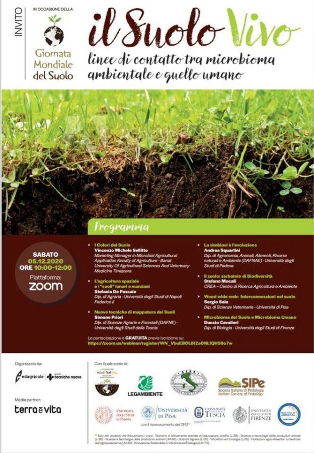 Pe 5 Decembrie a fost proclamată “Ziua Mondială a Solului”, zi, care are drept scop protejarea planetei și a resurselor acesteia, mai exact protejarea Solului. Solul este definit și ca fiind „epiderma vie a Pământului”, o sursă complexă și prețioasă de care depinde supraviețuirea umanității. În data de 5 decembrie 2020, la ora 11:00, vă invităm într-o călătorie virtuală și împreună să pătrundem în lumea necunoscută și captivantă a solului și a microbiomei (microbiontei) sale pentru a înțelege cât de important este solul pentru bunăstarea umanității. Cei care vor fi ghizi în aceasta călătorie virtuală și care vă vor introduce în lumea mirifică a solului, sunt cercetători și profesori de renume din centre de cercetare și universități din domeniul agrar din Italia care, datorită experienței și cercetărilor realizate de-a lungul timpului, vor ilustra într-un mod simplu și eficient conceptele de biodiversitate a solului, modul de abordare și monitorizare al acestuia, rolul microbiomului și agro-mediu și bineinteles care este strânsa legătura dintre sol, microbiomul solului și microbiomul uman. Eveniment este organizat prin intermediul organizatiei FAO și este sponsorizat de Legambiente, Societatea Italiană a Științei Solului (SISS), Societatea Italiană de Pedologie (SIPe) și Edagricole.