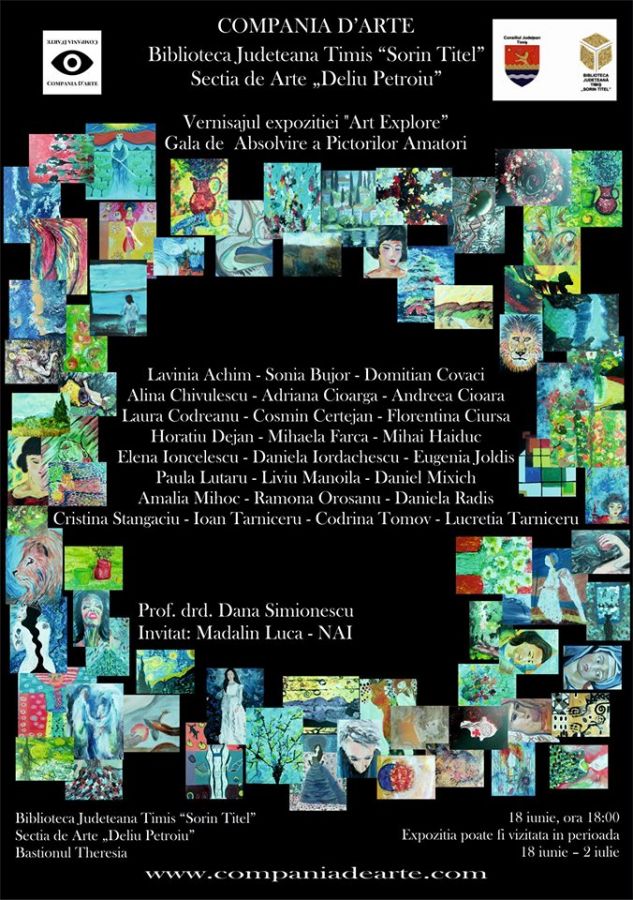 Compania D'arte vă invită la vernisajul expoziției de pictură "Art Explore” - Gala de Absolvire a Pictorilor Amatori, la Biblioteca Județeană Timiș “Sorin Titel” - Secția de Arte „Deliu Petroiu”, la Bastionul Theresia, în 18 iunie, ora 18:00. Expoziția poate fi vizitată în perioada 18 iunie – 2 iulie.