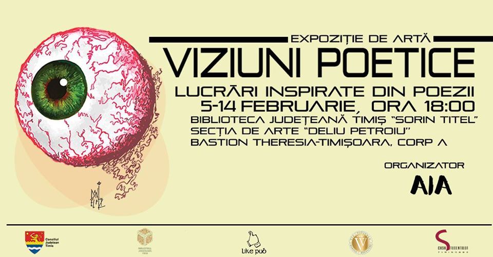 AIA vă invită în data de 5 februarie 2020, de la ora 18.00, la un vernisaj inedit al Expoziției „Viziuni Poetice” în cadrul căreia veți avea ocazia să vă delectați cu lucrări create pornind de la poeziile unor scriitori aflați la începuturile carierelor în domeniul literaturii.
