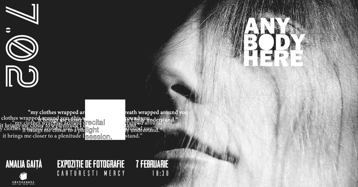 Vernisajul expoziției ANY BODY HERE are loc la Cărturești Timișoara, în 7 februarie, începând cu ora 18:30. Deschidem seara cu un recital Light Session - Amalia Gaita & Vlad Cotruş.