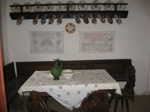 Culoarea, decorul si moda diferentiaza etnic mobilierul romanesc de cel al minoritatilor. Bucataria maghiara are o banca coltar si o masa, iar deasupra bancii cuierul blidar cu vase decorative de Corund. Pentru bucataria germana este caracteristic credentul pentru vase cu un blidar perforat in partea de sus, pentru farfurii din portelan sau faianta decorativa, cu un dulap pentru vase in partea de jos si masa inalta cu patru scaune cu spatar. In bucataria germana este amenajat un colt pentru spalat cu un scaun perforat care sustinea un lighean. La maghiari mobilierul din camera este pictat cu motive florale cu rosu, alb si verde. in camera mare din casa germana, un scrin cu trei sertare servea de altar al casei avand pe el un crucifix, Biblia, cartea de rugaciuni si statuete reprezentand sfinti, iar deasupra scrinului o icoana cu Sfanta familie. In casele maghiare, germane, slovace, cehe si sarbe pe peretii bucatariei se puneau carpete din panza brodate cu texte amuzante referitoare la intelegerea si dragostea intre soti sau care urau mesenilor pofta buna. Romancele au adoptat aceste carpete dar si lada de zestre pictata cu motive florale de la maghiari si germani.