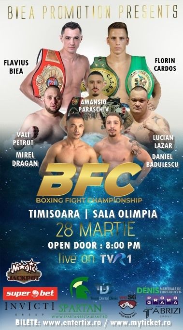 BFC( Boxing Fight Championship) by Biea Promotion este o continuare a evenimentelor " Noaptea Spartanilor 1 si 2" si aduce si de aceasta data in fata publicului sportivi valorosi din box,kick-boxing si kempo fiecare dintre acestia luptand pe reguli de box.